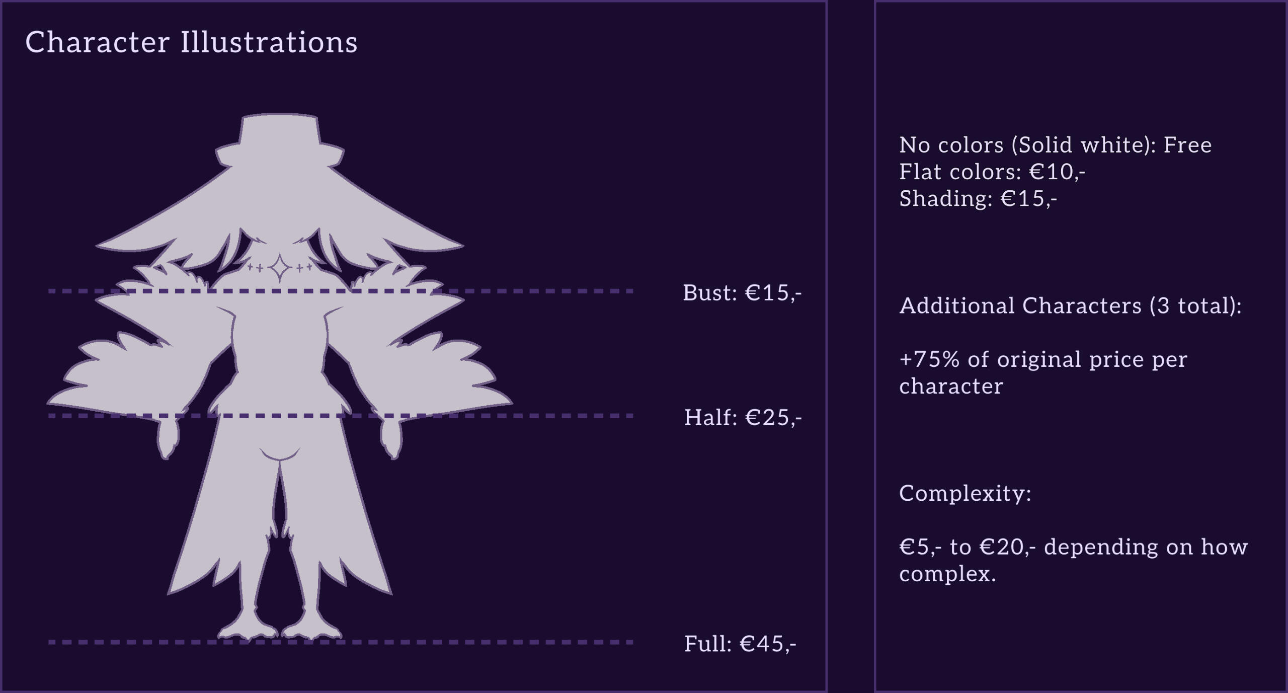 Character Design (25% of total price): I can design a character for you, using image references or information you give me. WARNING!: If no (character) sheet can be provided, this charge automatically applies. This is not a service to receive a character sheet! I will maintain the type of commission you requested.
